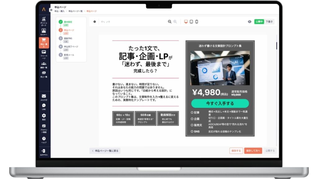 セミナー視聴ページとは独立した形で、ノーコードによる本格的なLPの作成が可能です。LPごとに1商品を紐づける設計とすることで、ウェビナー施策と連携しながら、視聴から購入までを一貫した導線で設計できます。